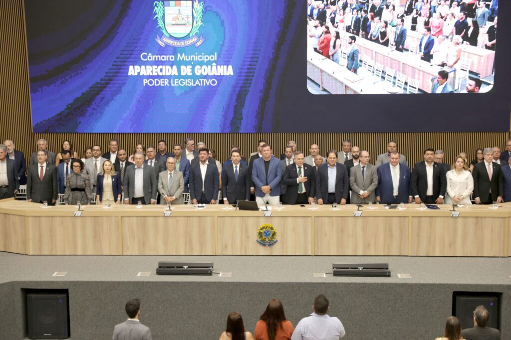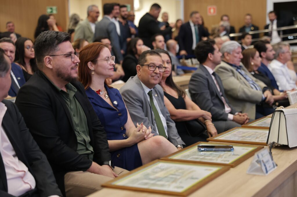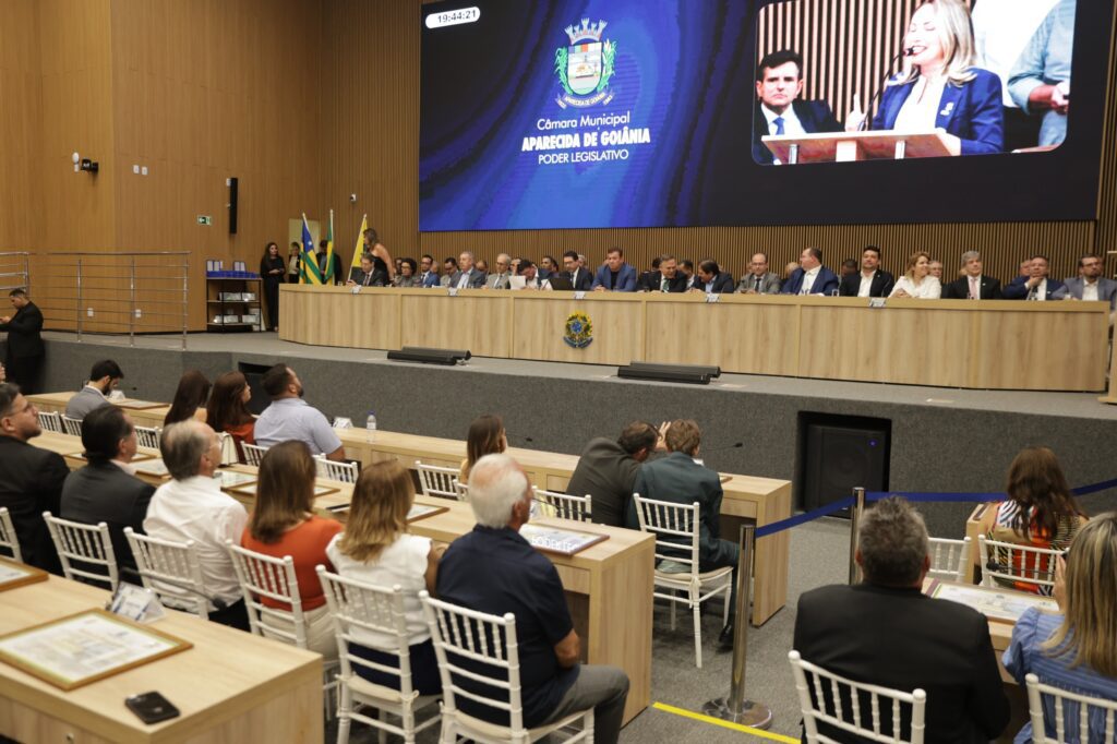 Grandes personalidades da política e do setor empresarial foram homenageadas na noite desta terça-feira, 16, durante Sessão Solene da Câmara Municipal de Aparecida de Goiânia em comemoração aos 40 anos da Associação Comercial e Industrial de Aparecida de Goiânia (ACIAG). Entre os agraciados com a Medalha do Mérito Legislativo “Norberto José Teixeira”, maior honraria do Legislativo, estiveram o prefeito de Aparecida de Goiânia, Leandro Vilela, o prefeito de Goiânia, Sandro Mabel, o presidente da ACIAG, Maxwell Coelho, o deputado federal Glaustin da Fokus, o presidente da Fecomércio, Marcelo Baiocchi, o presidente da FAEG e do Conselho Deliberativo do Sebrae, José Mário Schreiner, além dos ex-prefeitos aparecidenses Ademir de Oliveira Menezes e José Macedo de Araújo, do secretário estadual de Indústria e Comércio, Joel de Sant’Anna Braga Filho, e de outras lideranças que marcaram a história da entidade.